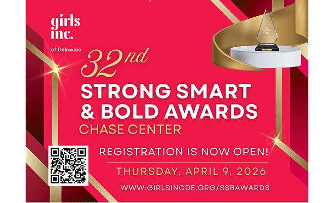 Celebrating women who model strong, smart, and bold leadership is another important part of our work. On April 9, at the Chase Center in Wilmington, Girls Inc. of Delaware will host the Strong, Smart & Bold Awards and Fundraiser, a signature event that honors exceptional women while raising critical funds to support our mission. The event highlights the connection between the leadership girls see and the leaders they can become.